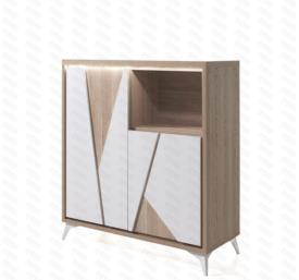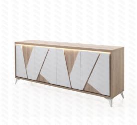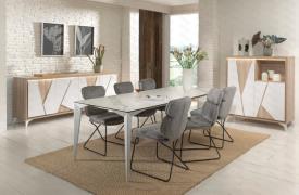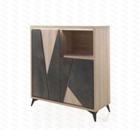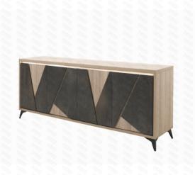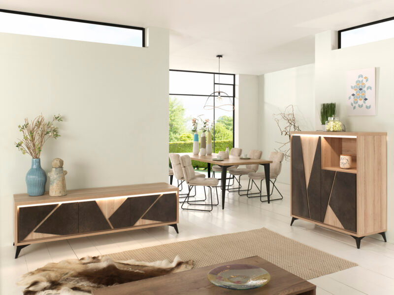 Lievens Chêne Cuneo nature + Façade Polar white OU Titanit anthracite (brun) Pieds métal – finition poudre noir ou blanc mat Chants ABS 1 mm Fermeture avec amortisseur soft-close Préassemblé mais démontable enfilade 4 portes : l 225 x h 90 x p 50 cm vitrine haut (1 porte pleine - 1 niche) : l 110 x h 190 x p 50 cm rangement (2 portes pleines - 1 niche) : l 117 x h 132 x p 50 cm meuble tv : l 155/185 x h 59 x p 50 cm table basse (1 porte - 1 niche) : l 120 x h 43 x p 60 cm table repas, chaise