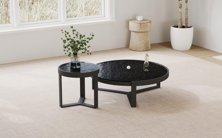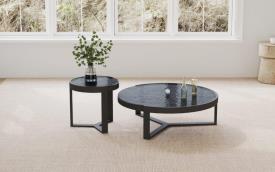 Dimensions : Ø 48/103 x h 33,5/48 cm Matière principale : Dessus en verre à eau Couleur principale : Noir Matériel de pied : Métal Couleur de pied : Noir table basse